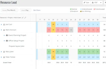 - Gráficos de carga de trabajo de recursos, planificación de capacidad, utilización de recursos y realización de cargas de trabajo en tiempo real