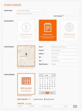 Configure su evento como multilingüe si desea manejar a un público internacional: todos los idiomas que elija serán aplicados a la página del evento, formulario de inscripción en línea a eventos y mensajes de correo electrónico. También tendrá la opción de añadir rápidamente la localización de su evento y observarlo en el mapa de google. Abra el calendario, organice varias fechas o sesiones temáticas y fije el cierre de inscripción.