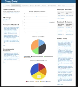SnapEval permite a los profesionales de recursos humanos: Capacitar a los gerentes para entrenar a los empleados con retroalimentación oportuna y procesable Alinee a los empleados con los valores y objetivos de la organización Documentar automáticamente el rendimiento de los empleados en tiempo real Obtenga una visibilidad integral de los niveles de rendimiento y las tendencias en toda la empresa Reemplazar o mejorar las revisiones de rendimiento anuales tradicionales
