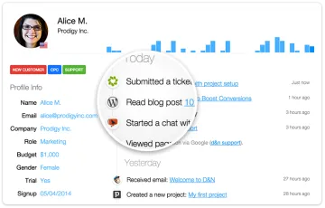 Con un conjunto de integraciones de un solo clic y la capacidad de rastrear cualquier acción personalizada, Woopra une los datos de sus clientes, lo que ayuda a los equipos a identificar obstáculos y oportunidades en los momentos más importantes.